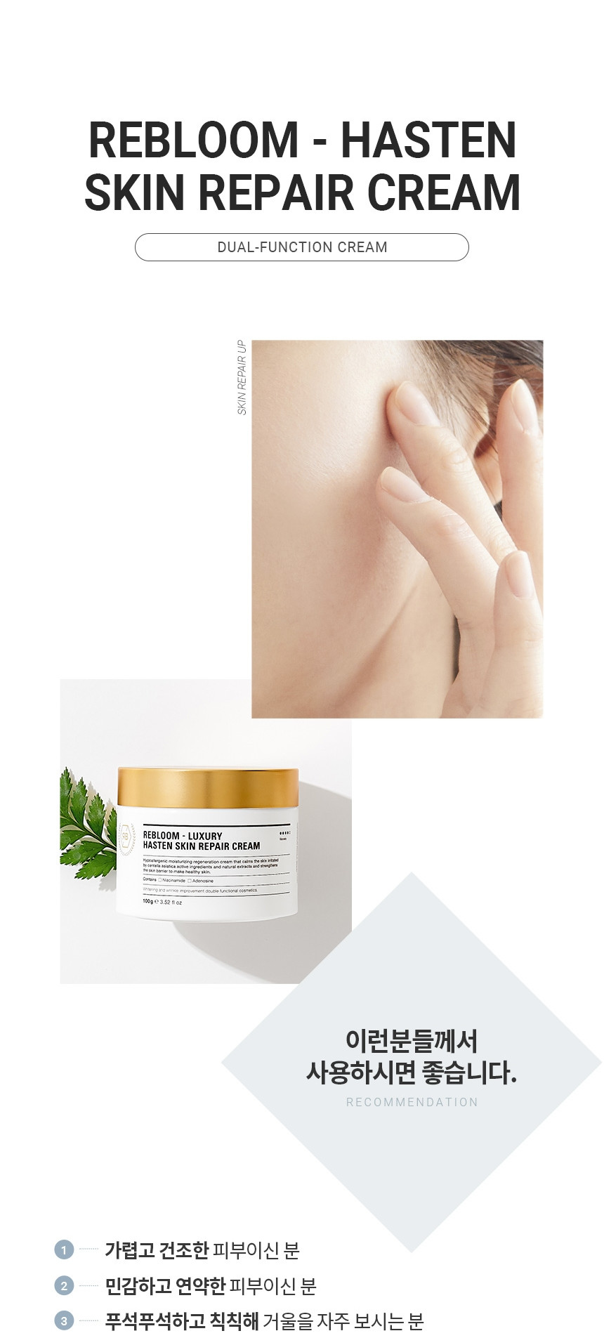 건조한 피부에 보습케어, 자극받은 피부 손상 회복+ 수분+보습+탄력회복